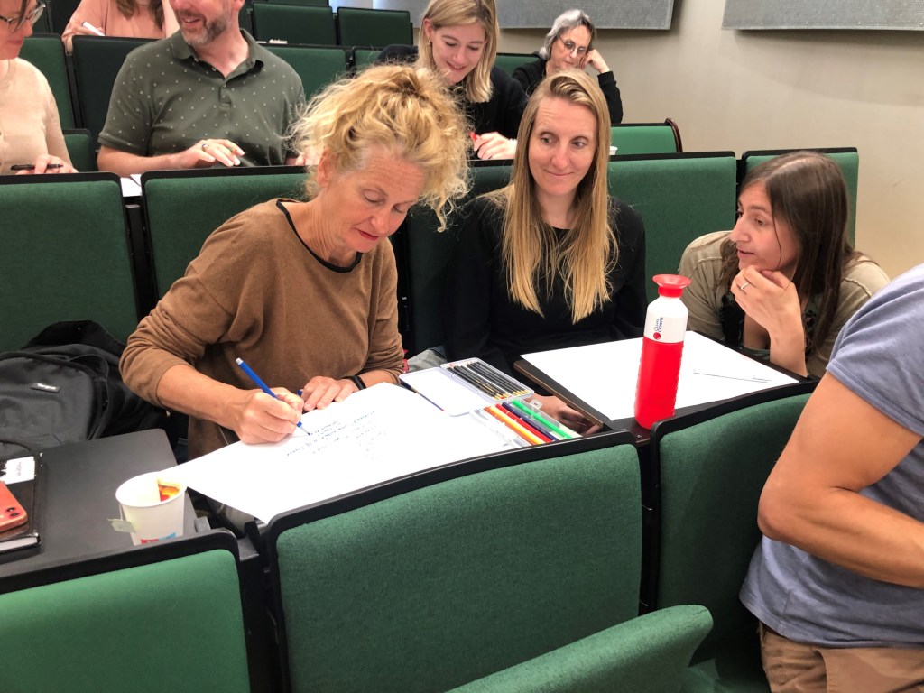 Vervolgens gingen de deelnemers in gesprek over de vragen die zij hadden op gebied van arts-based research, zoals “hoe geef je intuïtie een plek in de wetenschappelijke wereld?” en “welke plek kan ABR hebben binnen het onderwijs”? Uiteindelijk gaven de deelnemers de prioriteit aan het bespreken van twee vragen: 1) Hoe kan academische kennis bestaan zonder verbale vorm/taal? en 2) Hoe kun je ABR gebruiken om een ‘third space’ (veilige onderzoeksruimte) te creëren? Vervolgens visualiseerden de deelnemers hun associaties met een van deze twee vragen op een canvas. De deelnemers waren aan het eind van de sessie echter nog lang niet uitgepraat. Al met al genoeg reden om de dialoog over deze bijzondere methodiek in de toekomst voort te zetten!